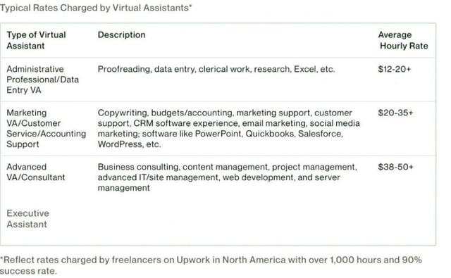 Twitter A virtual assistant needs to be proactive and a go-getter above all else. But they should also be well-versed with the latest tech tools, showing an impressive comfort level with communicating and coordinating via mainstream digital channels, along with any popular office-specific software.The rates for virtual assistant services depend on many factors. The major ones are remote workers’ location, experience, expertise, job type, frequency, and technical knowledge. Whether the virtual assistant works as an independent contractor or part of a BPO company also plays an equally crucial role. The following image shows the hourly rate charged by various North American virtual assistants on Upwork, a leading online marketplace for freelance talent.